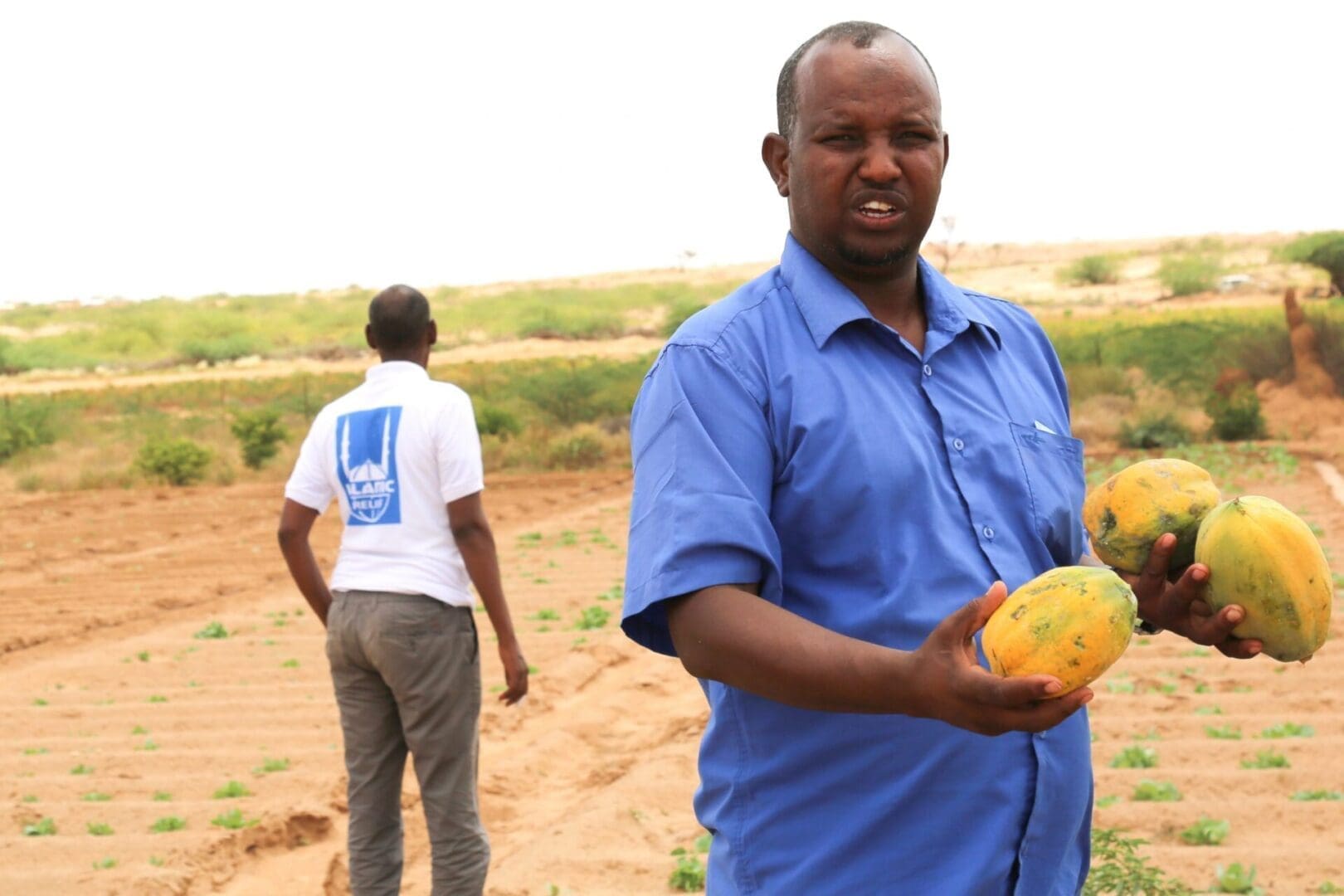 “Our living conditions were not good and there was no farming at all in our village. Islamic Relief gave hope back [to the community] and encouraged us to start farming again. As you see, I am holding a pawpaw that grew on my farm after the support of Islamic Relief.”