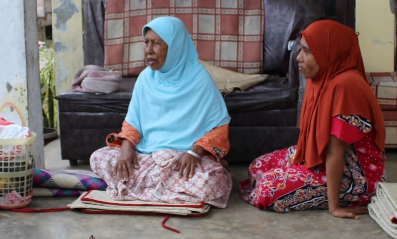 Aisha ran to nearby Darussalam mosque. Her family followed, but only two of her children made it to safety. Aisha lost nine family members in the disaster. She originally went to the mosque for refuge but stayed there for five months, sleeping on the floor where she felt safe.