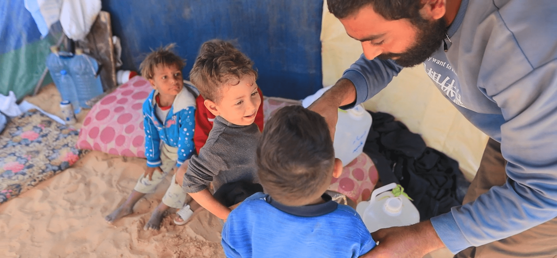 3 children share a single blanket between them, and the family tries to huddle together at night to keep warm, but it is not enough to keep out the cold.